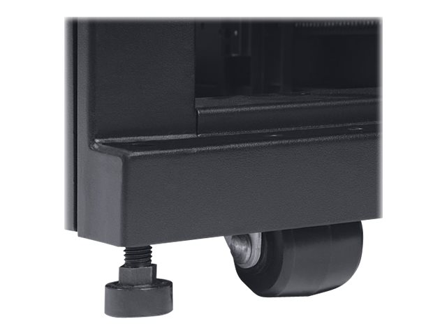 To simplify deployment, the SR48UBWD comes with preinstalled casters that enable it to be easily maneuvered into the desired location, where it can be secured by adjusting the preinstalled levelers. Note: the casters are intended for minor position adjustments and are not designed for moving the enclosure over long distances.