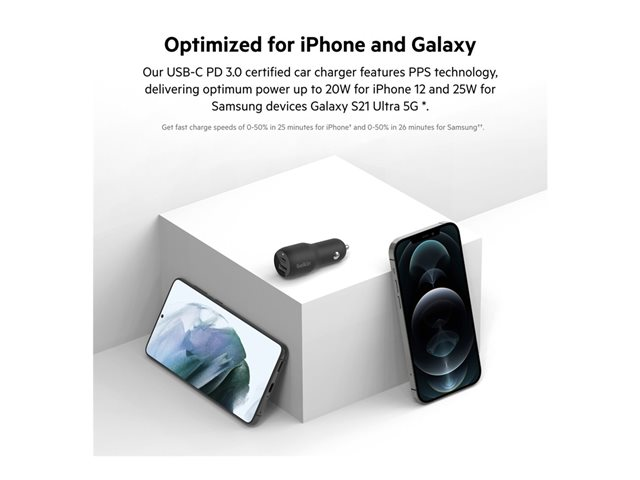 Power both iPhone and Samsung devices while on the road with our compact and powerful BOOST?CHARGE Dual Car Charger. This car charger is engineered with PPS technology, delivering a dynamic power output depending on the device its connected to, making it a safe and powerful option for a variety of devices. It also has a 12W USB-A port to charge a second device at the same time.