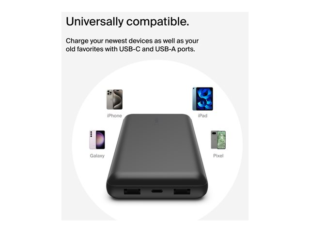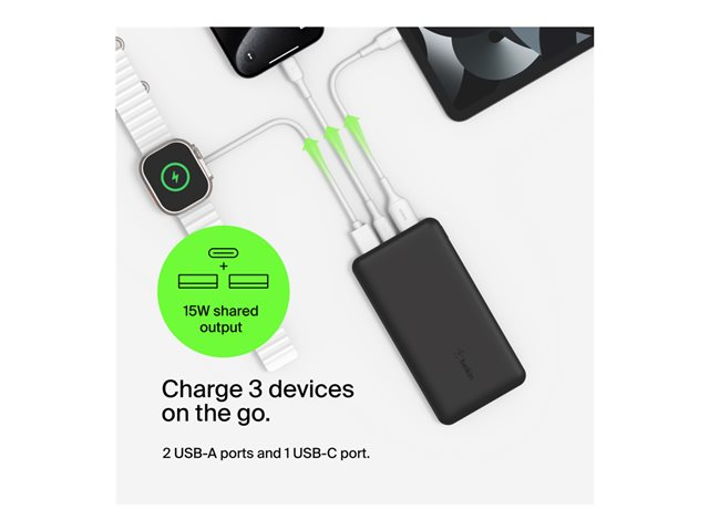 Charge up to 3 devices at the same time with Belkin compact and powerful Power Bank 20K. It has 2 USB-A ports and 1 USB-C port, delivering a total of up to 15W when using all 3 ports.