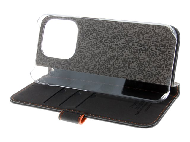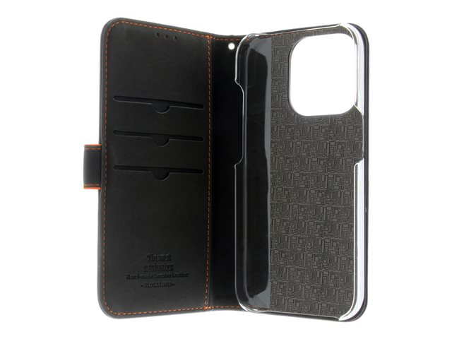 Insmat Exclusive - Lommebok for mobiltelefon - ekte skinn, polykarbonat, kartong+papir+aluminiumsfolie - svart, oransje - for Apple iPhone 15 Pro