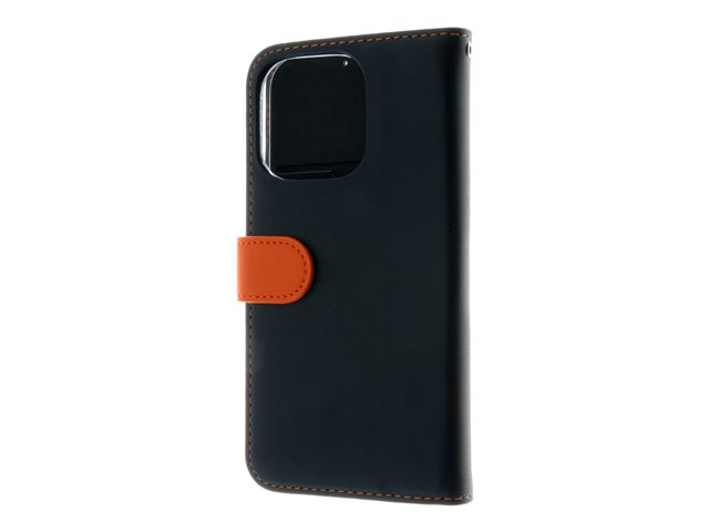 Insmat Exclusive - Lommebok for mobiltelefon - ekte skinn, polykarbonat, kartong+papir+aluminiumsfolie - svart, oransje - for Apple iPhone 15 Pro 650-3194
