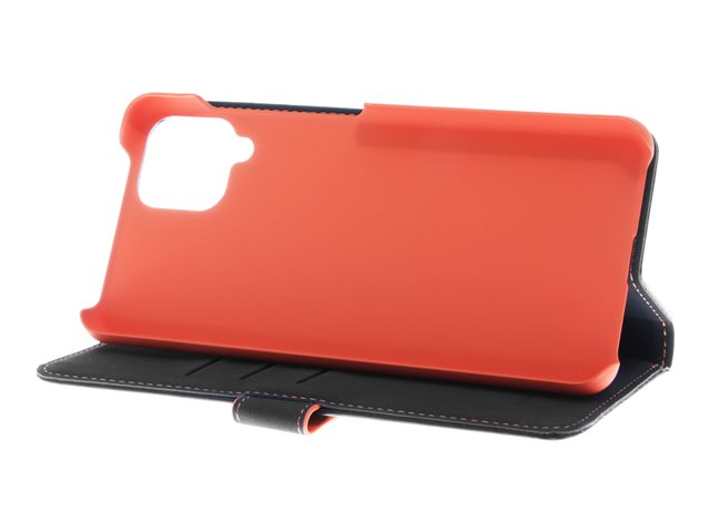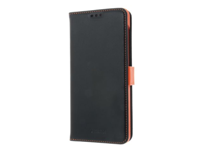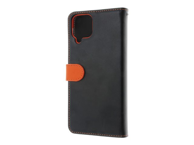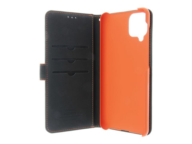 Insmat - Lommebok for mobiltelefon - ekte skinn, termoplast-polyuretan (TPU), polyuretanpolstring - svart, oransje, galvanisert bronsering - for Samsung Galaxy A12 650-2971