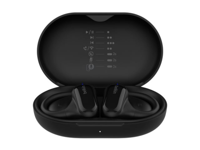 The Belkin SoundForm ClearFit earphones deliver a listening experience with Environmental Noise Cancellation technology, ensuring clarity in audio even in noisy environments. Engineered for versatility, the earphones feature a robust wireless connection via Bluetooth 5.3, allowing pairing with various devices, including iPhone, Android phones, and computers. They provide a comfortable over-the-ear mount with open ear design, making them ideal for long periods of wear while offering an impressive max sound pressure of 100 dB for audio enjoyment. The built-in microphone enables clear calls and voice assistance, making them suited for on-the-go lifestyles.