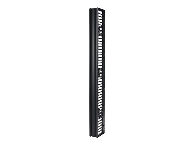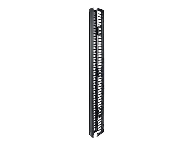 This 6” wide, high capacity vertical cable manager for 2 and 4 Post open frame racks features a single-sided cable channel with multiple internal cable tie-off locations and smooth plastic fingers at 1U increments for organized patching applications.
