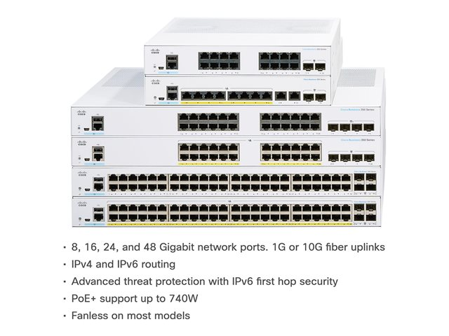 The Cisco Business CBS350-24T-4G switch is part of the fully managed switch line that delivers reliable and secure connectivity for small business networks. These switches accelerate your digital transformation by delivering full Layer 2/3 capabilities, intuitive web dashboard, advanced networking features, and PoE+ support.