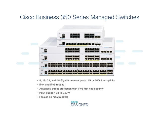 The Cisco Business CBS350-24T-4X switch is part of the fully managed switch line that delivers reliable and secure connectivity for small business networks. These switches accelerate your digital transformation by delivering full Layer 2/3 capabilities, intuitive web dashboard, advanced networking features, and PoE+ support.