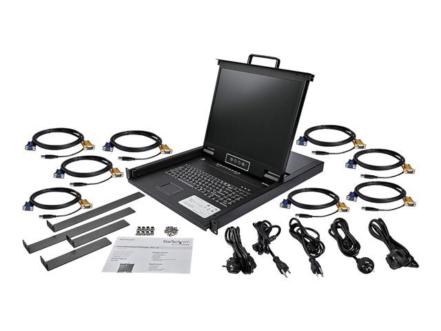 This KVM console provides complete keyboard, monitor and mouse control for eight computers. The console installs into 1U of rack space, offering a space-efficient solution for complete console control.